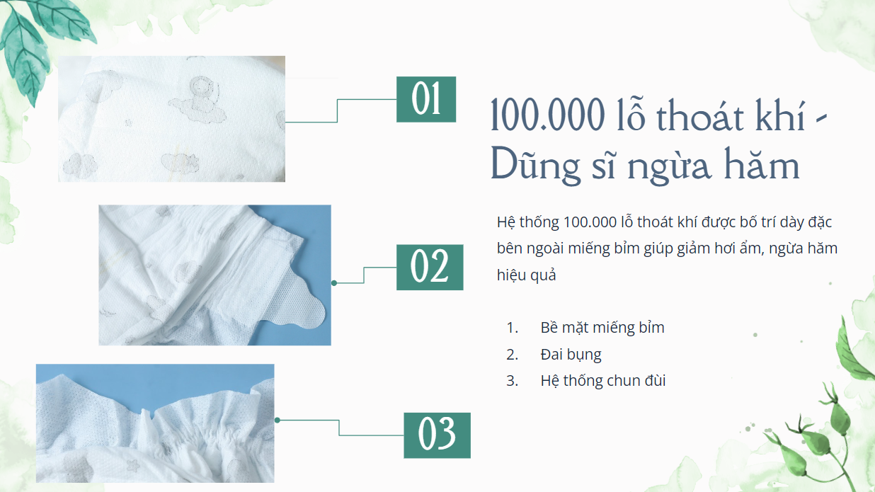 100.000 lỗ thoáng khí: được bố trí dày đặc bên ngoài miếng bỉm giúp giảm hơi ẩm và ngừa hăm hiệu quả