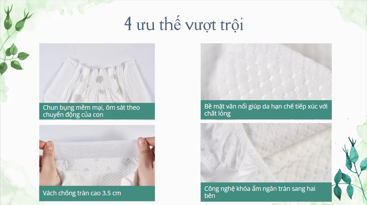 Chất liệu: polyme siêu thấm, polyethylene, giấy airlaid và vải không dệt
